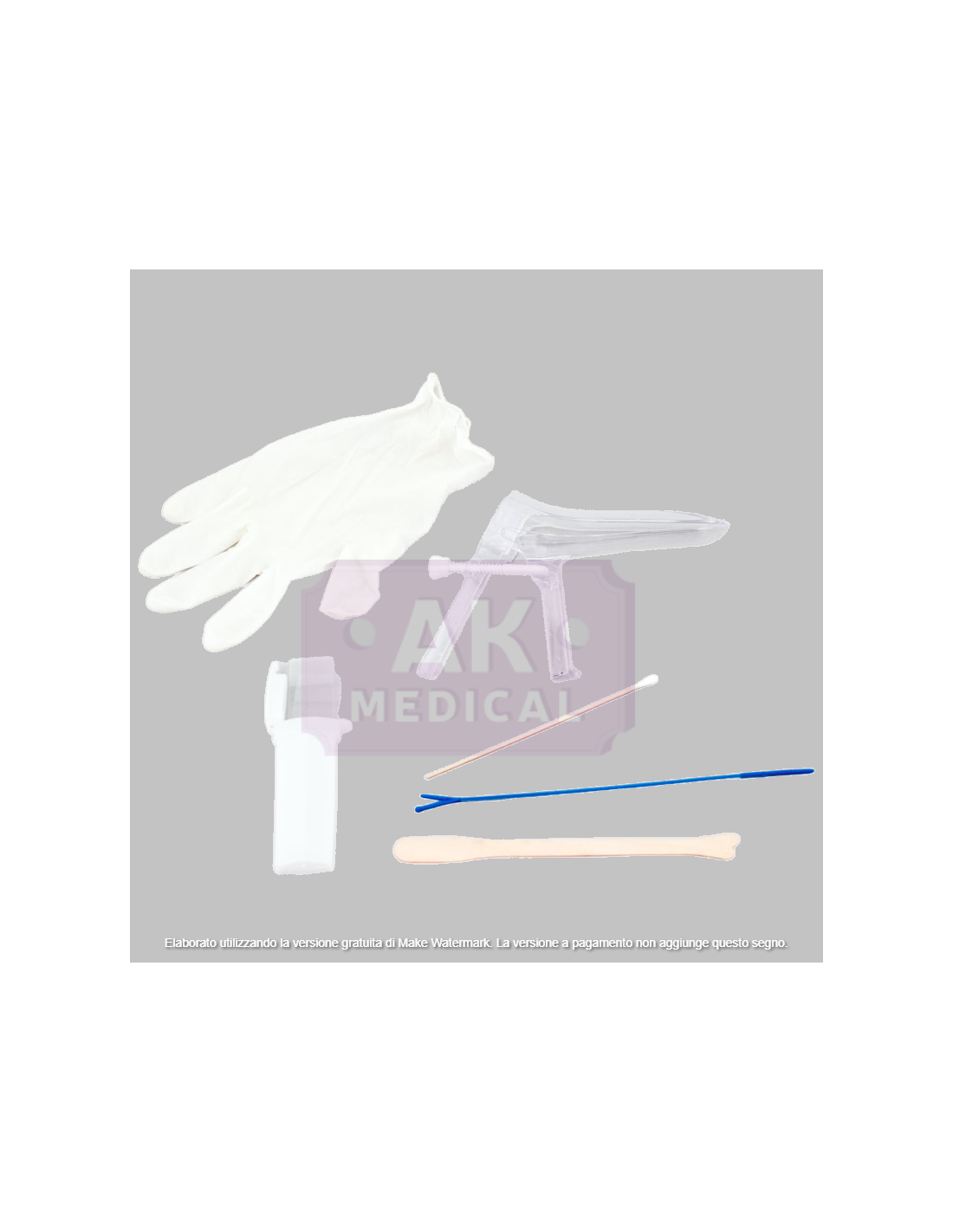 Il kit per pap-test si compone di: nr 1 Speculum a vite laterale misura GRANDE, nr 1 guanti in lattice, nr 1 minicontainer per vetrini, nr 1 spatola di Ayre, nr 1 tampone ovattato, nr 1 sonda per prelievo Endocyte, nr 2 vetrini.